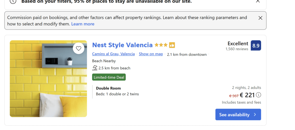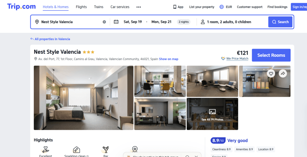 Our Nest Style Valencia test found a deal that reduced the price from €367 to €221. That is a 40% reduction. Booking.com does not advertise these prominently, but they exist. Check before assuming Trip.com is cheaper.