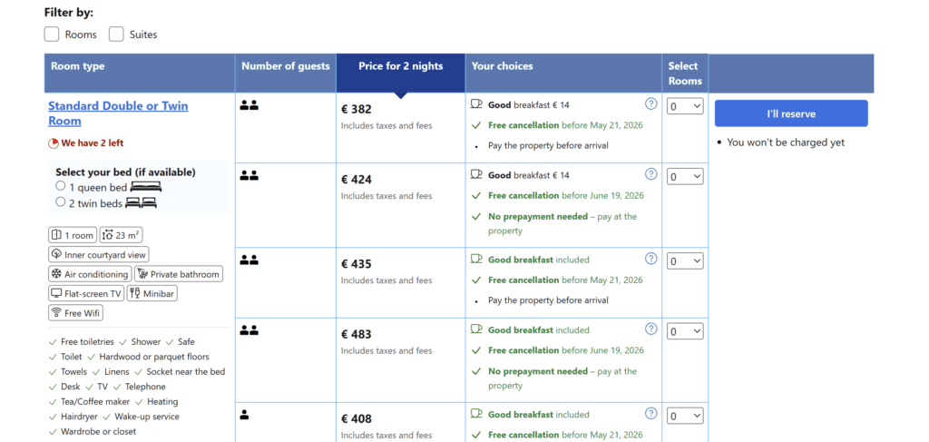 - Booking.com: €382 total for 2 nights (Standard Double or Twin Room, includes taxes and fees)