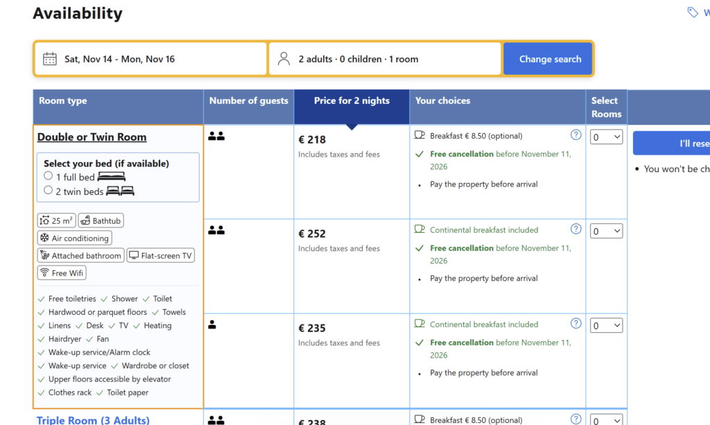 - Booking.com: €218 total for 2 nights (Double or Twin Room, includes taxes and fees)